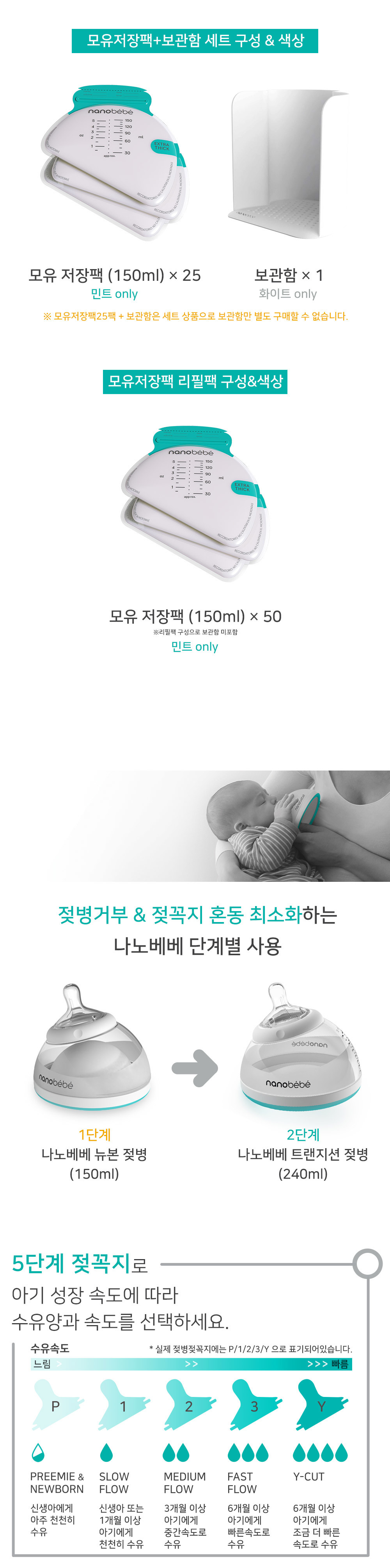 나노베베 젖병팩에는 슬로우 단계 젖꼭지 1개가 포함되어 있습니다. (1단계 뉴본젖병(150ml), 2단계 트랜지션젖병(240ml) 동일)