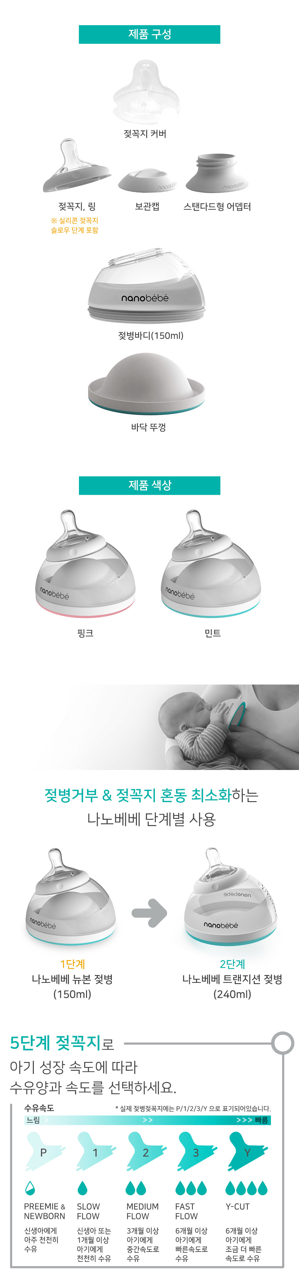 나노베베 젖병팩에는 슬로우 단계 젖꼭지 1개가 포함되어 있습니다. (1단계 뉴본젖병(150ml), 2단계 트랜지션젖병(240ml) 동일)