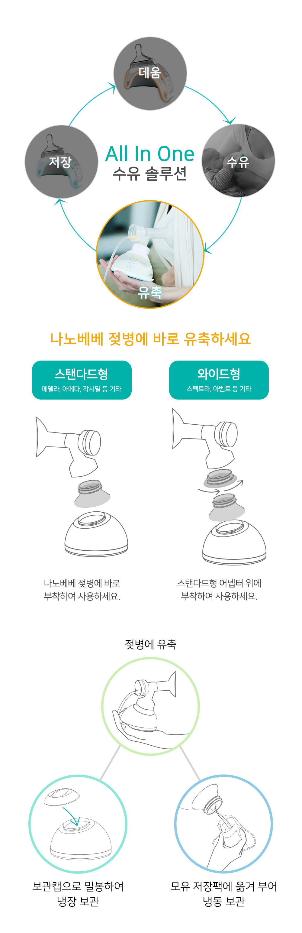 나노베베 뉴본 젖병(150ml)은 스탠다드형 유축기 어탭터를 포함하고 있으며, 메델라, 아메다와 같은 스탠다드형 유축기와 호환 가능합니다.