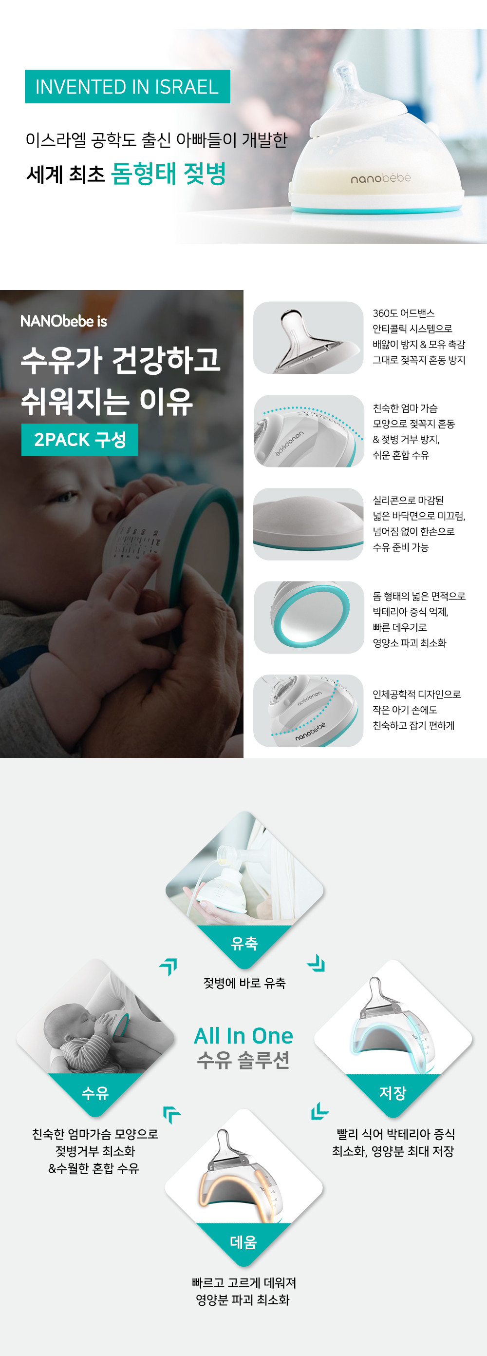 나노베베 1단계 뉴본젖병은 150ml 용량으로 신생아부터 사용할 수 있습니다. 또한 유축기 어댑터가 포함되어 있어 모유 수유에 최적화 된 제품입니다.