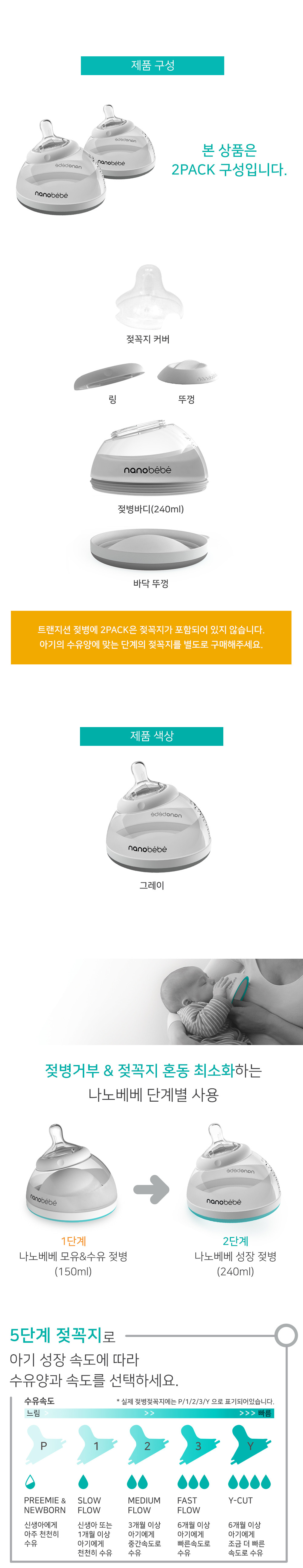 나노베베 젖병팩에는 슬로우 단계 젖꼭지 1개가 포함되어 있습니다. (1단계 뉴본젖병(150ml), 2단계 트랜지션젖병(240ml) 동일)